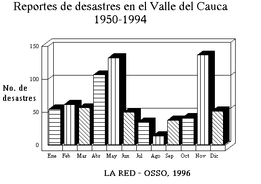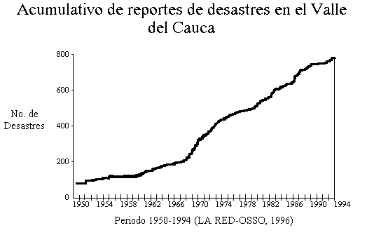 Los gráficos adjuntos tomados de este proyecto aportan, para el Valle del Cauca, durante el período 1950 a 1994, evidencia empírica sobre la distribución temporal (mayor concentración de desastres durante los períodos lluviosos, principalmente generados por inundaciones, avenidas torrenciales y deslizamientos) y sobre el aumento de la frecuencia de su ocurrencia (pendiente de la curva acumulativa). Los datos corresponden a 782 reportes obtenidos de fuentes hemerográficas.