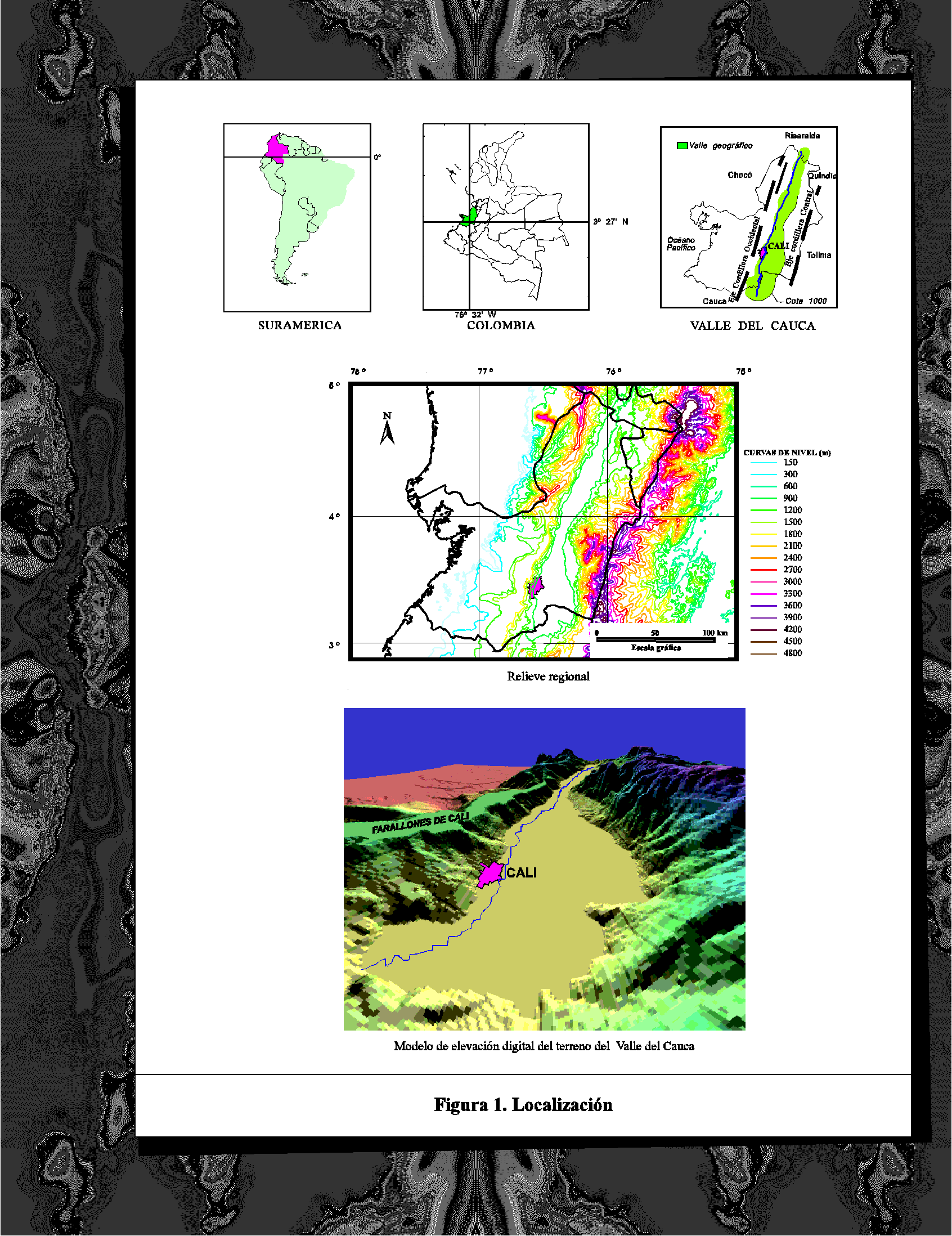 La región del Valle del Cauca está atravesada de Sur a Norte por la Cordillera Occidental, con altura media del orden de 2.000 msnm (exceptuando los Farallones de Cali al SW de la ciudad, con alturas máximas del orden de 4.200 msnm). La Cordillera Central, prácticamente paralela a la Occidental, pero con una altura media de más de 3.500 msnm, separa las cuencas paralelas del Cauca y del Magdalena. La cuenca del Cauca, hasta el Norte del Valle, tiene una longitud de unos 300 km de largo y unos 50 km en su parte más ancha, de modo que el río fluye hacia el Norte alimentado por las aguas de numerosos tributarios que bajan de las montañas, irrigando las tierras del fondo del valle.