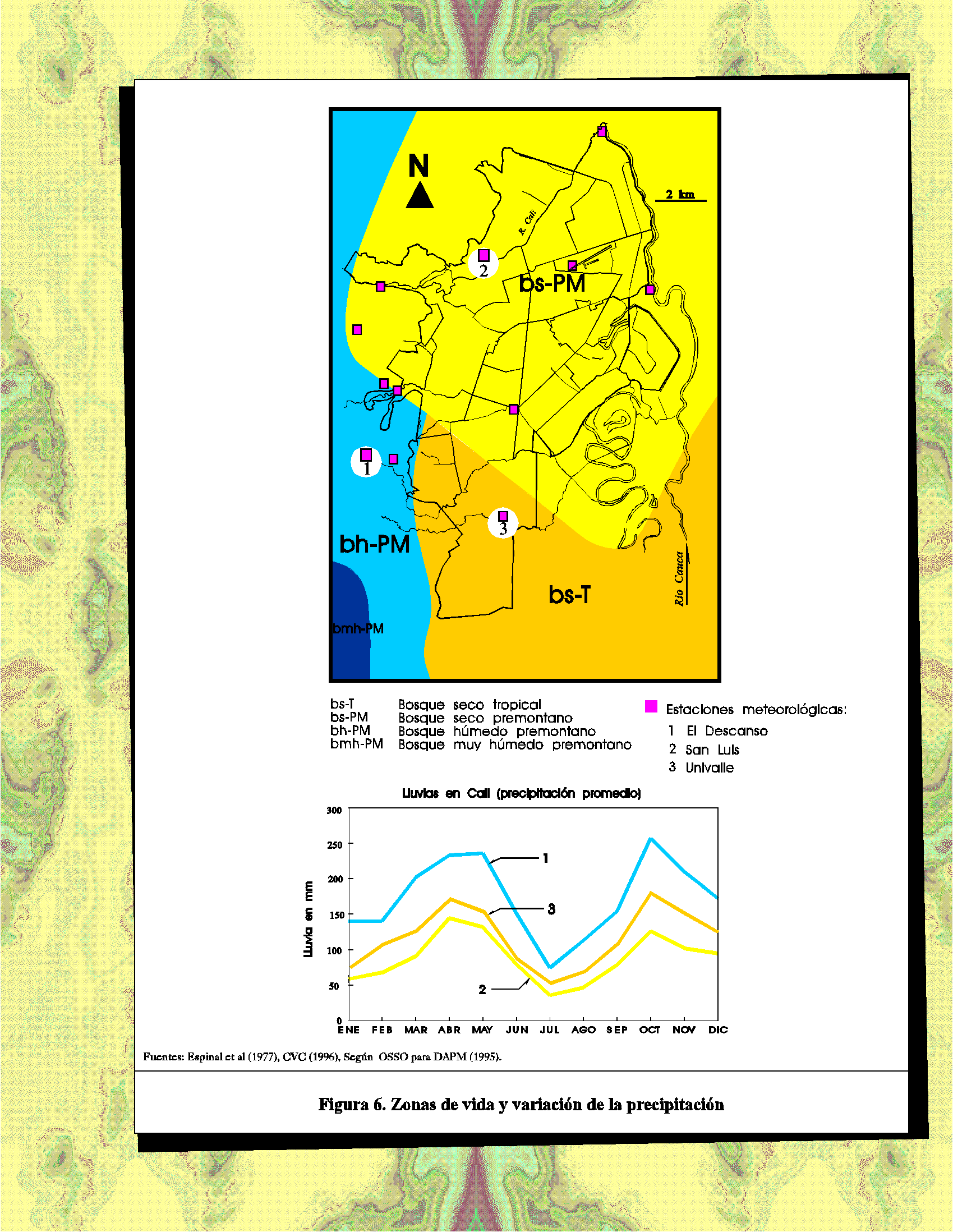 Las Zonas de Vida son una expresión de las condiciones climáticas en función de la precipitación promedio anual, la evapotranspiración potencial y la altura sobre el nivel del mar. Las Zonas de Vida bosque seco tropical (bs-T) y bosque seco pre-montano (bs-PM), predominan sobre el área urbana, con límite hacia la cuenca del río Cañaveralejo, (hacia donde es mayor la precipitación media anual), como se evidencia al comparar los registros de las estaciones meteorológicas El Descanso y San Luis. Hacia los Farallones de Cali al SW, las Zonas de Vida se caracterizan por un aumento de la precipitación, que puede también observarse en la Fig. 5.