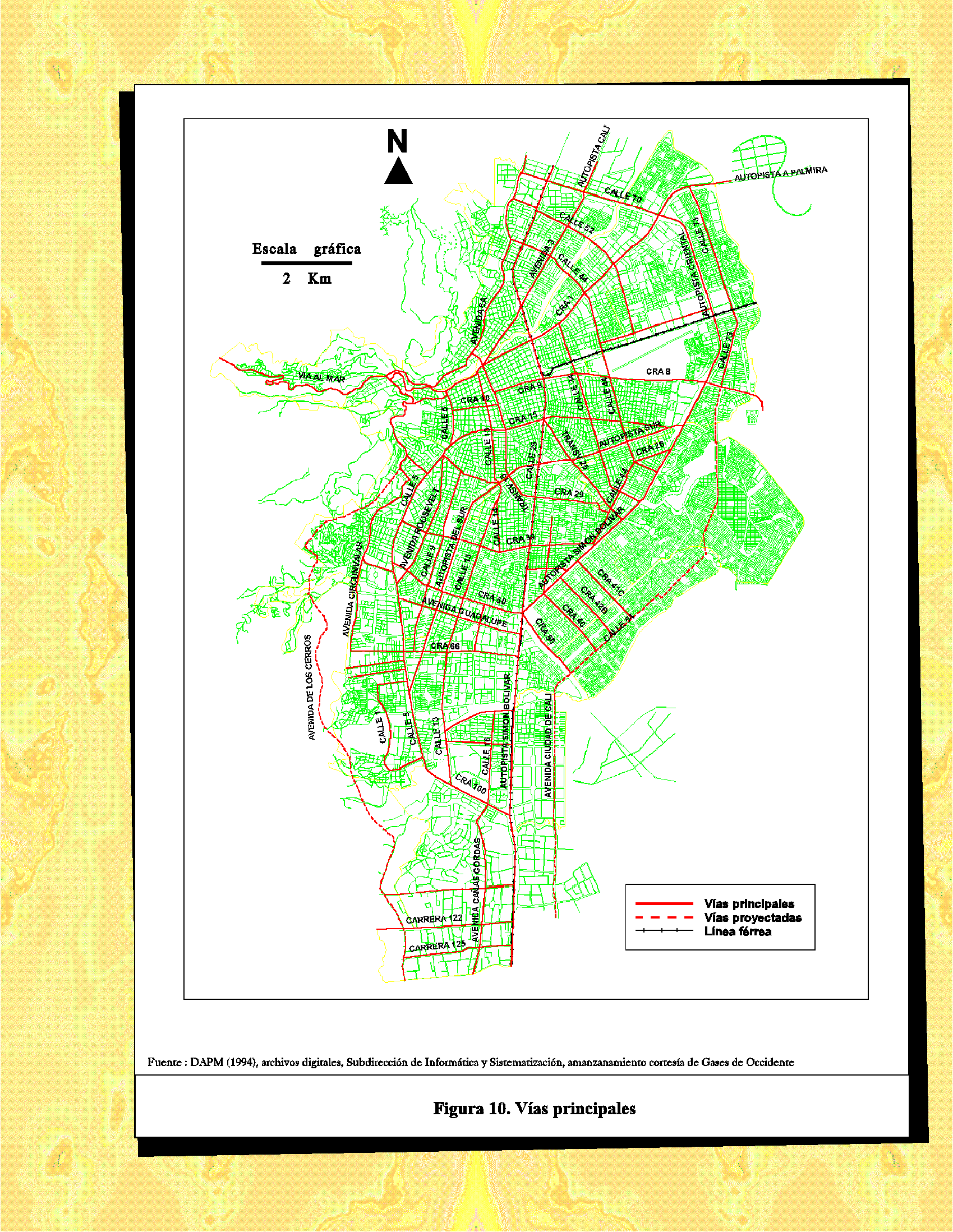 El Plan de Desarrollo del Municipio en su Estrategia de Infraestructura Vial, Tránsito y Transporte (DAPM, Todos Planificamos Cali, 1996) contempla recursos por cerca de 410.7 millones de dólares para las vigencias de 1996 y 1997. Los proyectos viales incluyen el mantenimiento y rehabilitación de todas las estructuras de puentes urbanos, el mantenimiento de toda la red vial, el aumento de la cobertura de programas de autopavimentación, la modernización de los sistemas de control de tráfico, la terminación de tramos faltantes y la construcción de vías rápidas como la Avenida Ciudad de Cali (al Oriente) y la Avenida de los Cerros (al Occidente) cuya porción Sur se ilustra en la Figura.