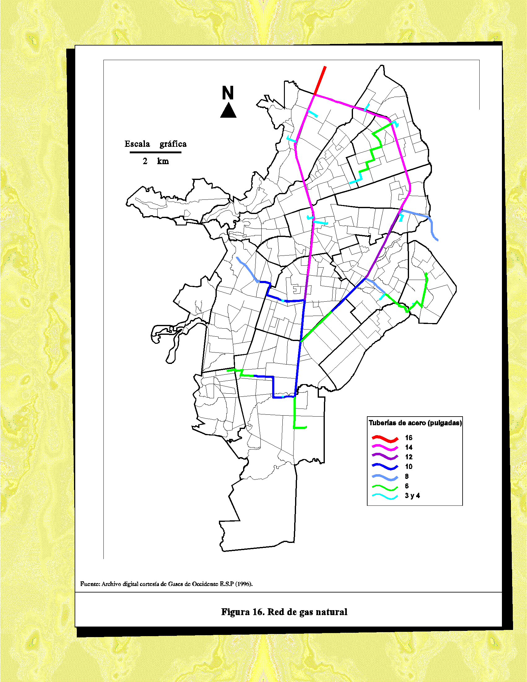 A diferencia de redes como las de acueducto y alcantarillado, la de Gas no presenta elementos articulados. Se trata de tubería de acero soldada y revisada mediante técnicas de Rayos X en cada punto de unión. Estas características le otorgan una flexiblidad frente a las vibraciones sísmicas mayor que la de otro tipo de redes. El sistema está diseñado con válvulas automáticas de seguridad y con otros elementos de control, también aprovechando las experiencias y desarrollos de esta industria en otros países. La red urbana de gas natural para Cali está siendo emplazada contando con estudios previos de amenazas por fenómenos naturales (OSSO para Gases de Occidente, 1996), siendo quizás el primer sistema de líneas vitales urbanas en Colombia que se emplaza con evaluaciones de este tipo. Una parte importante de las evaluciones del medio físico natural de este Plan se ha nutrido de los estudios realizados para Gases de Occidente E.S.P.