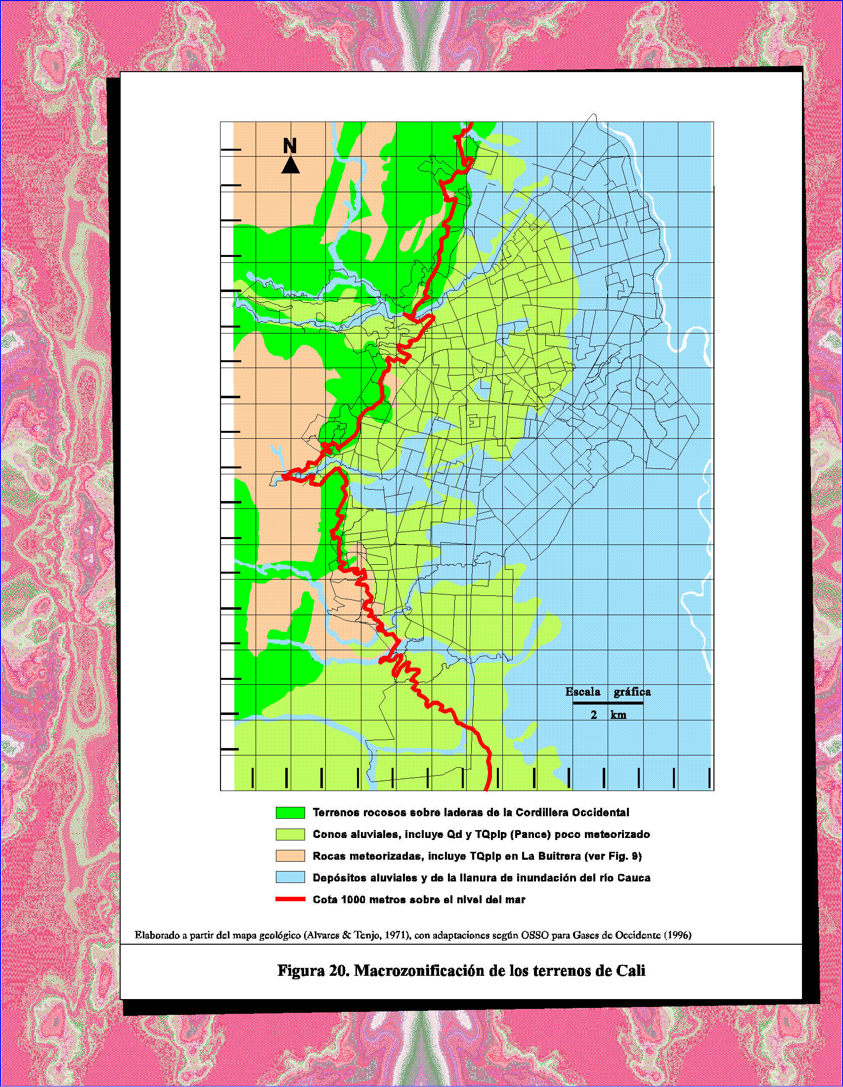 Esta macrozonificación es el producto de integrar unidades geológicas (Fig. 9) que, grosso modo, reunen características similares desde el punto de vista de su estabilidad, grado de alteración y propiedadaes geotécnicas. Sin embargo, debido a que los depósitos aluviales y de la llanura de inundación del río Cauca (en azul) pueden presentar drásticas variaciones en sus propiedades, se representan más detalladamente en la Figura 38.
