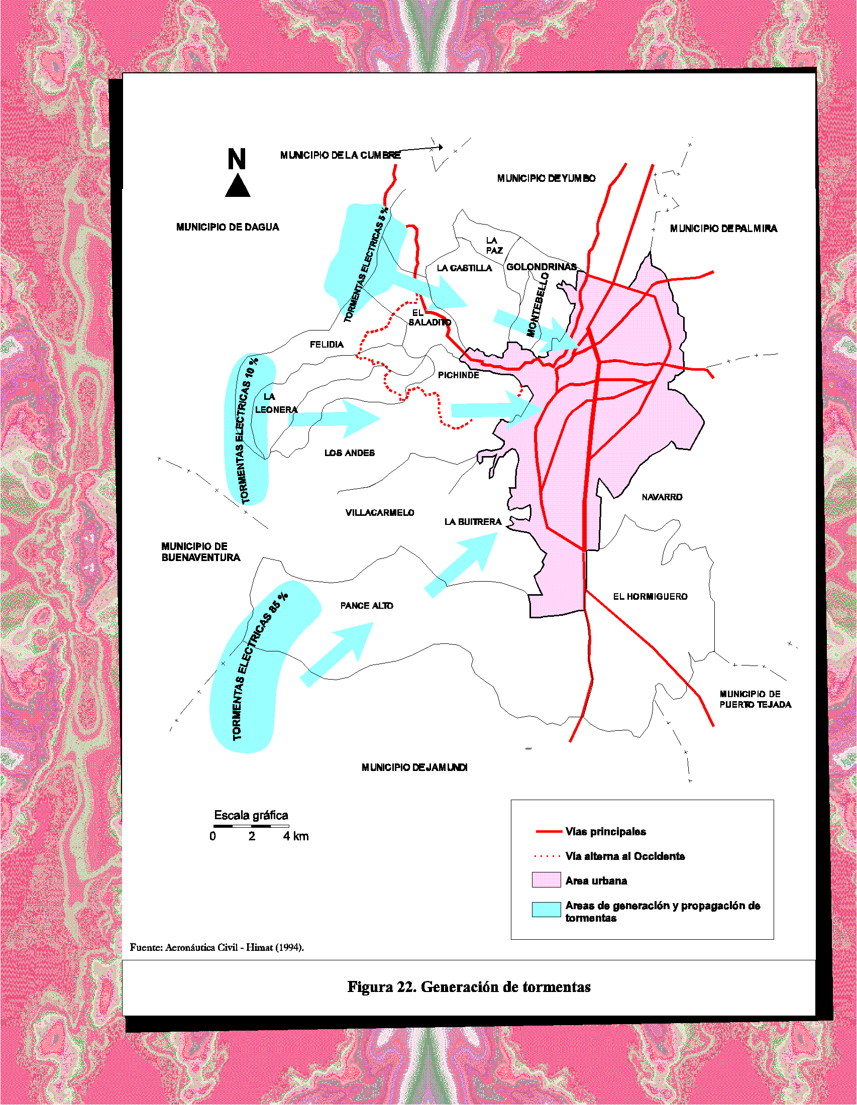 Ilustra las principales zonas de generación de tormentas eléctricas, sobre la Cordillera Occidental, el 85 0e las cuales provienen del SW (los Farallones de Cali). Las tormentas pueden estar acompañadas de lluvias torrenciales y vendavales, como aquellas ocurridas en julio de 1984 y de 1986 y en octubre de 1989, causando severos impactos en áreas rurales y urbanas. Las lluvias asociadas, según registros de estaciones operadas por la CVC, produjeron máximos de precipitación superiores a 100 mm, como consecuencia de las cuales hubo inundaciones y deslizamientos en las cuencas de los ríos Cali y Aguacatal.