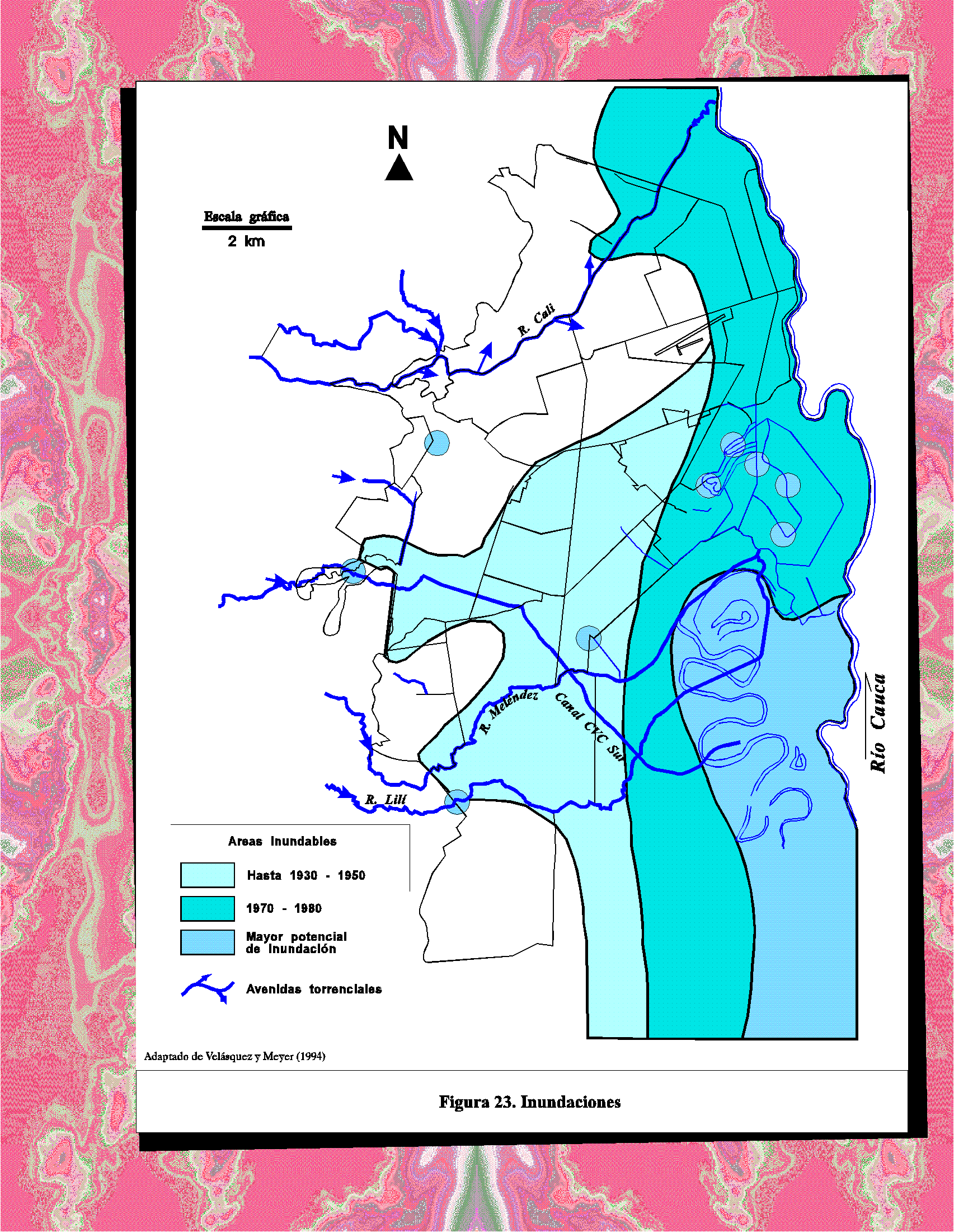 Mediante el acopio de información de archivos de prensa y de memorias (p. ej., Sarasti, 1983), así como por tradición oral de personas de 50 o más años de edad, el mapa representa una primera aproximación a la evolución de la inundabilidad, que por otro lado es expresión indirecta de las obras que la ciudad ha desarrollado para la protección de inundaciones. Hasta la década de 1950 cuando surgió la CVC y se iniciaron las obras de canalización y de contención de las crecientes periódicas del río Cauca, el nivel de sus aguas se encargaba de represar las de sus afluentes que a su vez inundaban los terrenos aledaños.