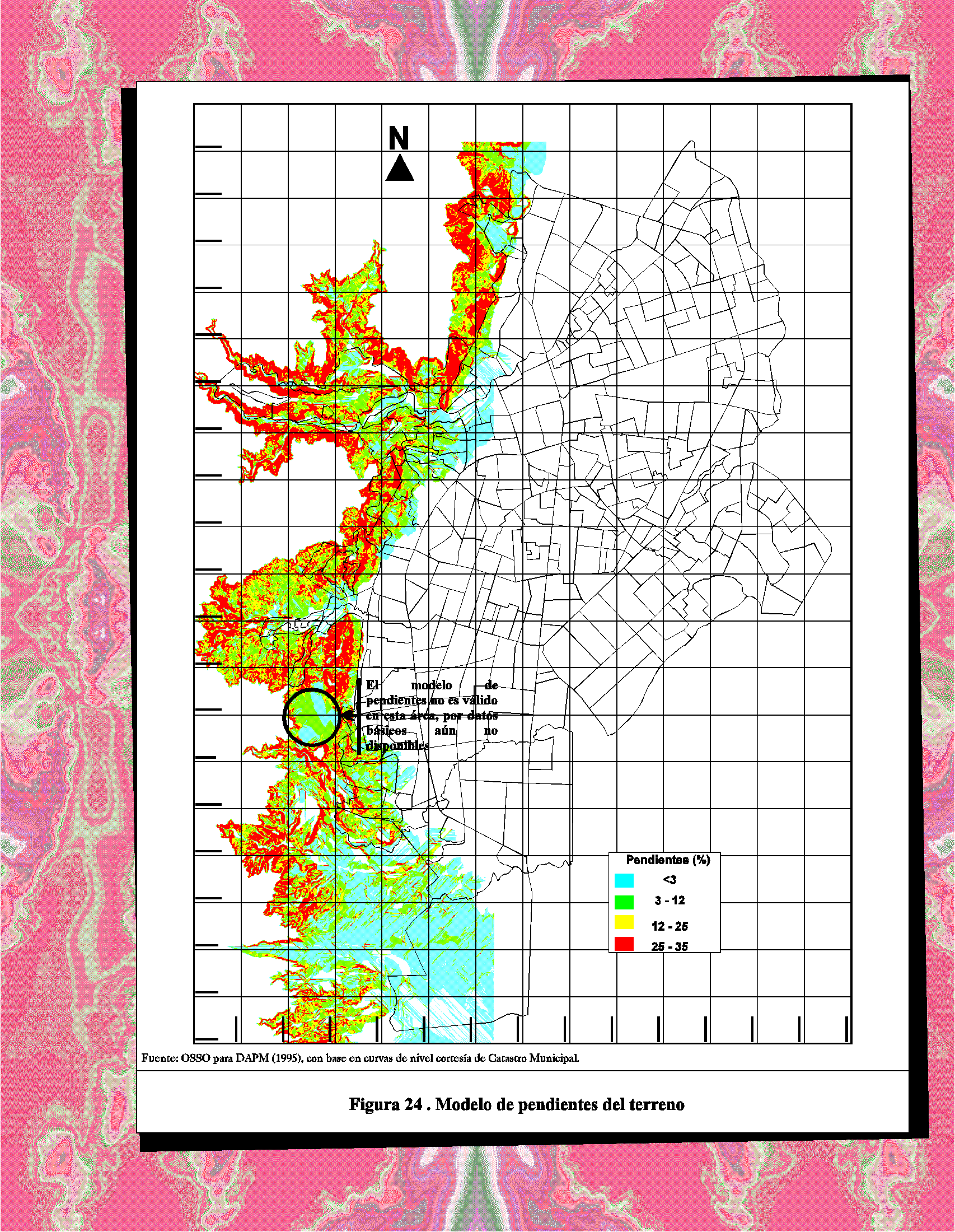 Para la zonificación de pendientes se obtuvo parte de la cartografía digital de Cali (curvas de nivel cada 5 metros). Esta información parcialmente ilustrada en la Fig. 37, fué suministrada por el SIGCALI a través de Catastro Municipal.