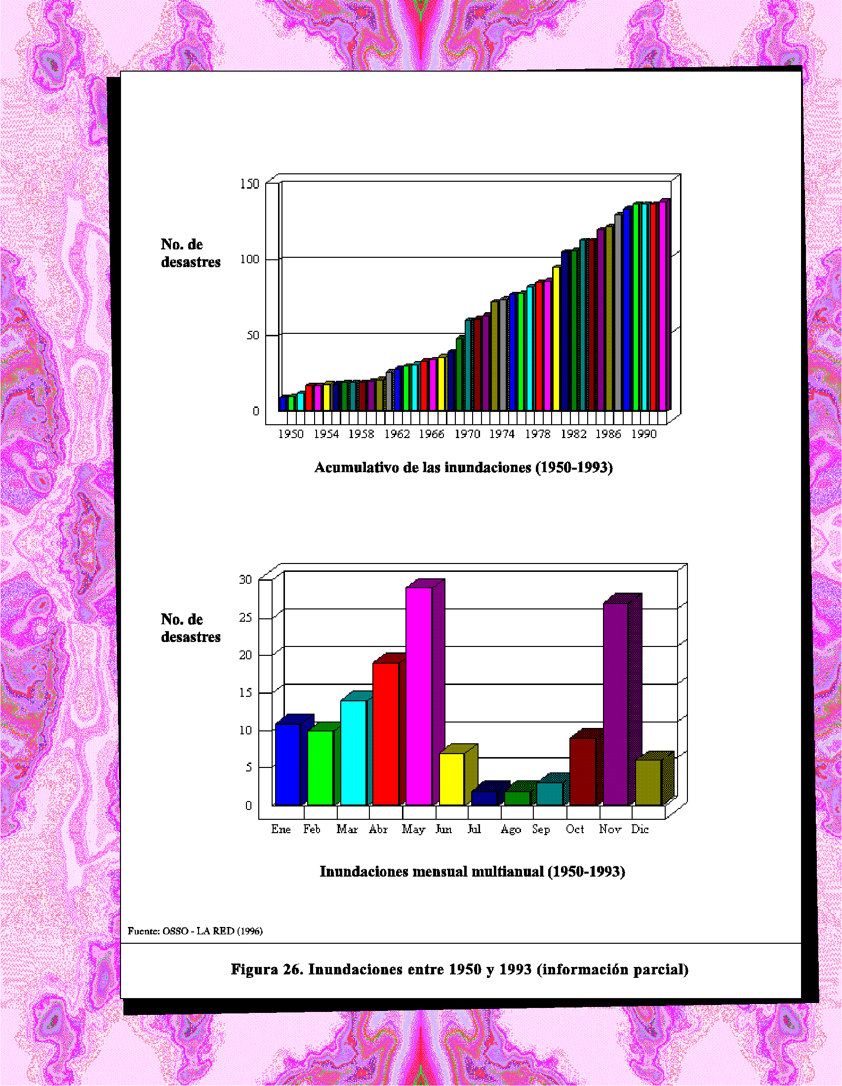 La información representada es de carácter parcial (igual que en la Fig. 28); ello se debe a sus fuentes: principalmente reportes de prensa, (Aguirre, 1994; OSSO-LA RED, 1996). Generalmente las noticias presentan sesgos por razones de distancia de los sucesos, de cobertura periodística, por coyunturas en torno a otras noticias, etc. Los sesgos también pueden deberse a presiones políticas y socieconómicas y de otros intereses, o símplemente a deficiencias en el mantenimiento de archivos e imposibilidad de exploración de toda la información.