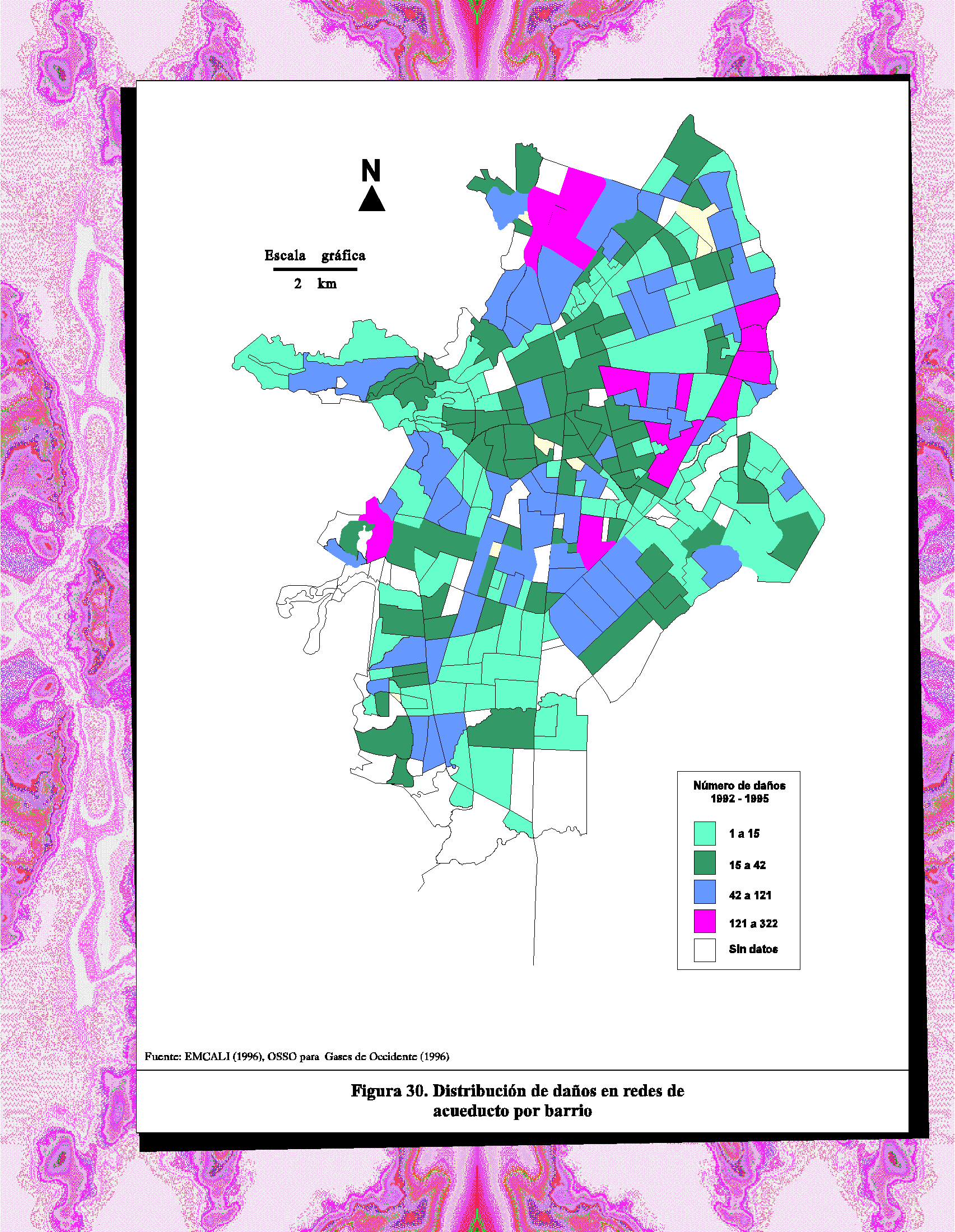 Debido a que en los datos originales no se dispone de reportes de causa de los daños, la interpretación de la información está sujeta a incertidumbres. No se conoce por ejemplo, si en algunos sectores se deben a la antigüedad o al tipo de las tuberías (por ejemplo de asbesto cemento, menos flexibles y duraderas). Sin embargo, en primera aproximación, los mayores reportes de daños corresponden a zonas con terrenos aluviales (ver Figs. 20 y 38) de suelos contracto-expansivos (p. ej. barrrio La Flora, Fig. 40), y a barrios sobre el piedemonte (Terrón Colorado, Siloé), en los cuales puede haber influencia de sobrepresiones desde los tanques y fuentes más elevadas (como el Acueducto La Reforma (Fig. 17) e incluso, por conexiones fraudulentas que causan fugas.